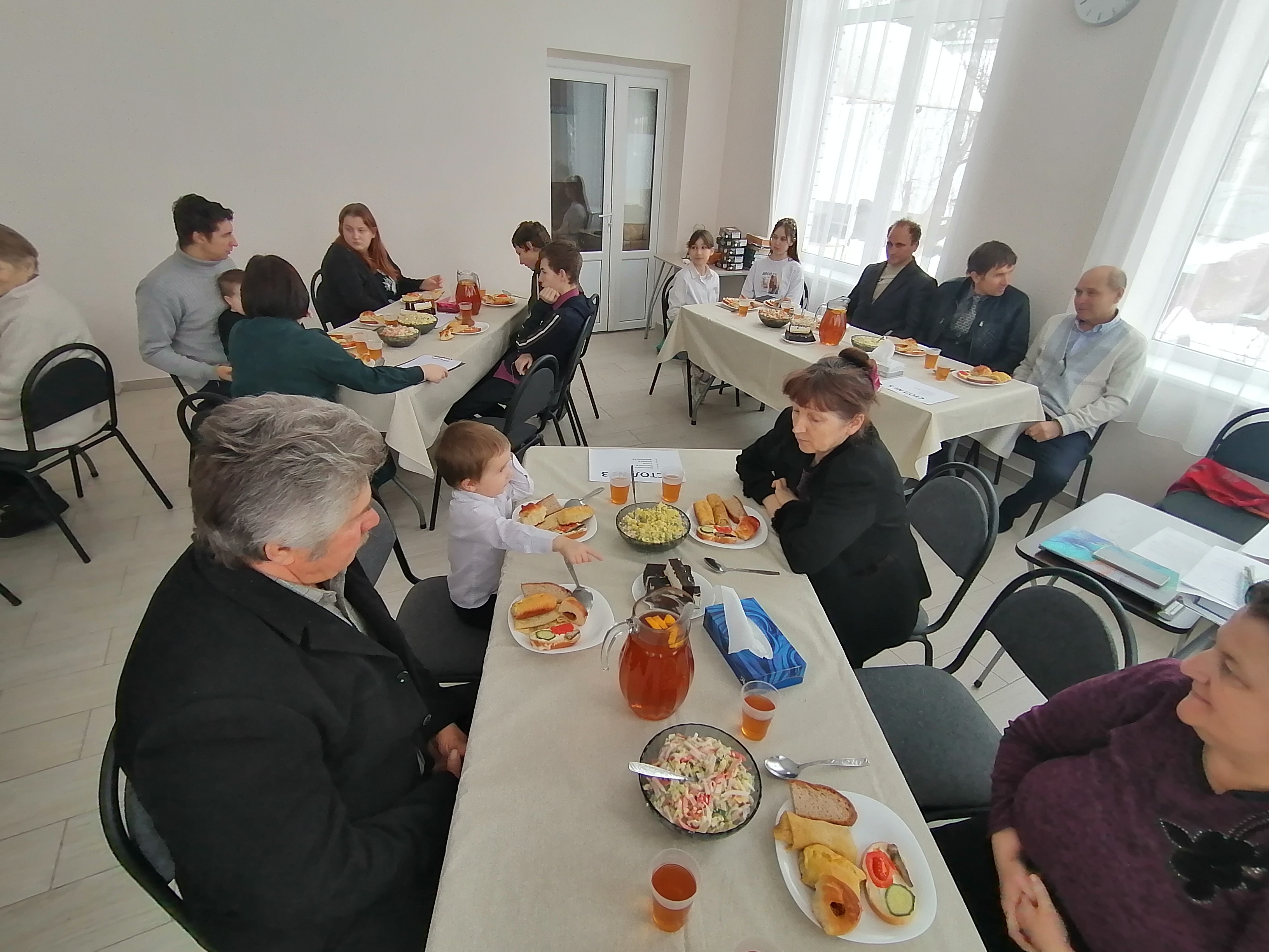 После Богослужения все уютно расположились за праздничными столами и начали дружескую беседу. Участники встречи пели и читали стихи, прославляя Бога. Были конкурсы и викторины о семейных отношениях. Вспомнили библейские истории и наставления. Особое внимание уделили тому, как правильно общаться друг с другом, как научиться слушать, а не только говорить, и как достичь взаимопонимания как в семье, так и в церкви.