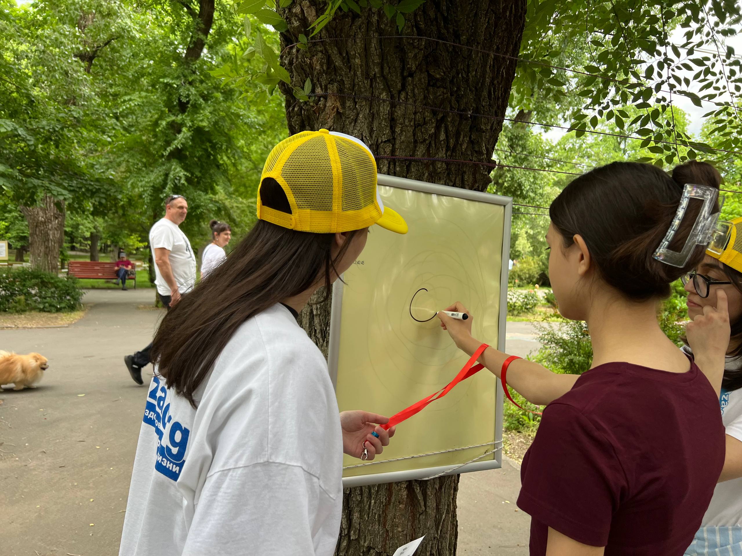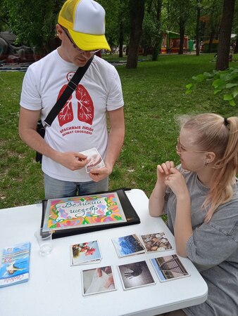 На одной из станций в формате игры было представлено, как зависимость мешает идти к цели: человек рисовал круг, а волонтеры тянули за ленточки, привязанные к его руке. Было смешно и очень наглядно.